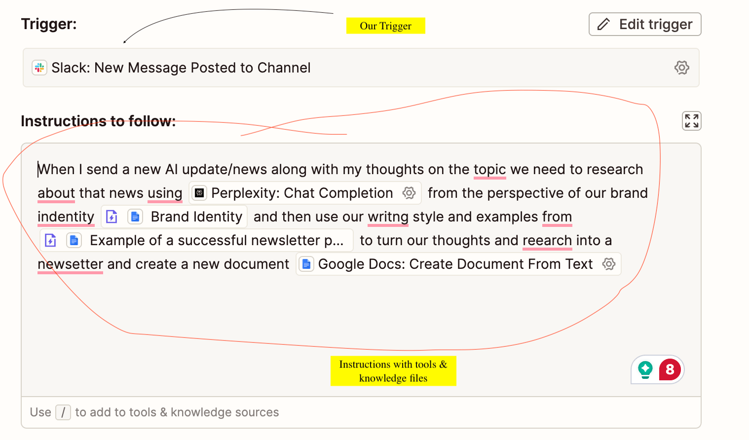 How building an AI Agent looks like: A trigger, Instructions with tools & knowledge