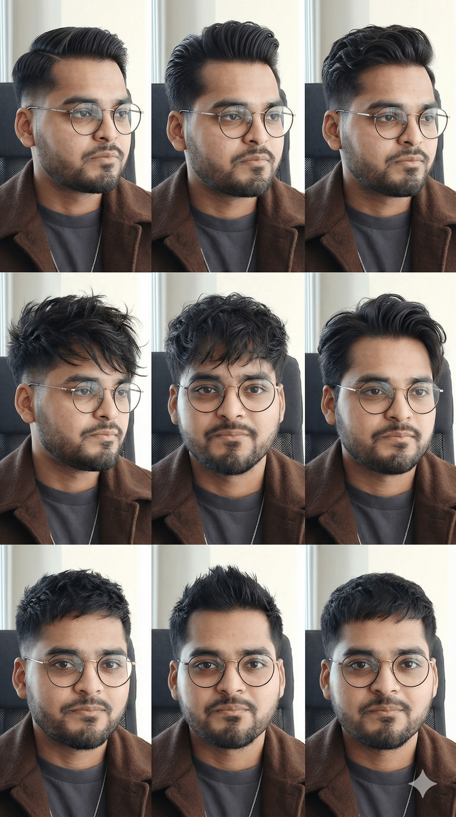 Analyze the single image I uploaded. Identify my exact face shape and hair type with precision. Then, generate a vertical 9:16 4K 3x3 grid of hairstyle reference images directly on my face.
